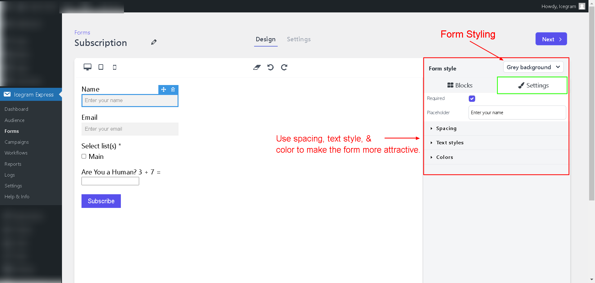 Captcha : There are various form validation checks included in the free version of Icegram Express, but we offer an option to enable captcha for better protection from spam with our paid plans. You can secure the form by enabling Captcha to block bots more effectively ( Available in Icegram Express Pro )