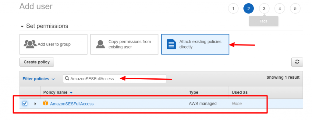 Then you need to search AmazonSESFullAccess in the search bar. This should return a result, named “AmazonSESFullAccess”.Tick the checkbox (on the left) of the returned result to add permission for the user.